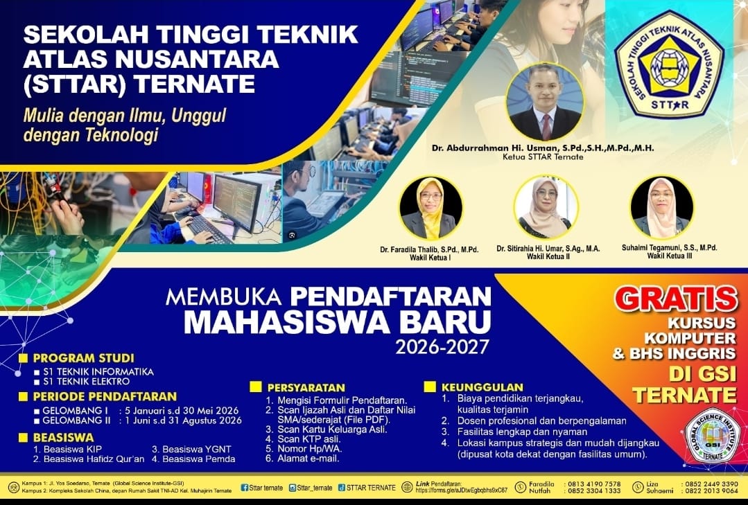Ternate — Sekolah Tinggi Teknik Atlas Nusantara (STTAR) Ternate membuka pendaftaran Penerimaan Mahasiswa Baru (PMB) Tahun Akademik 2026–2027. Pada tahun akademik ini, STTAR menawarkan dua program studi jenjang Strata Satu (S1), yakni Teknik Informatika dan Teknik Elektro.